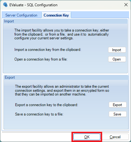 - When you first open EValuate, select the prompt to open the SQL Configuration Menu.