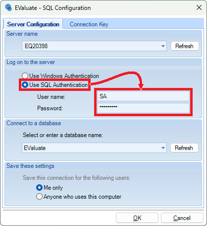 Note: Alternatively, the Use Windows Authentication method does work if the current signed in Windows User is linked to an Evaluate user. Find out how to link the Windows user to an EValuate user > - Once the authentication method is entered, to connect to the database, next to the database dropdown click Refresh and the database appears in the dropdown.