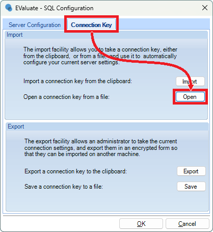 - Click the Connection Key tab and click Open.