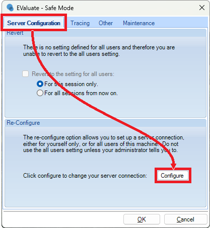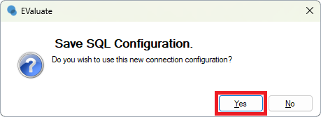 Note: If this does not appear or you want to change the SQL Configuration on an existing installation, on your keyboard, hold down the CTRL key when opening EValuate, then click Yes to open EValuate in safe mode.